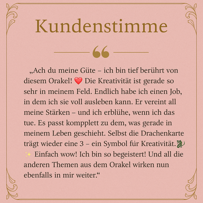 Deine Arbeit kann ich nur weiter empfehlen. Deine persönliche kartenlegung war der Hammer, anders kann man das nicht ausdrücken.